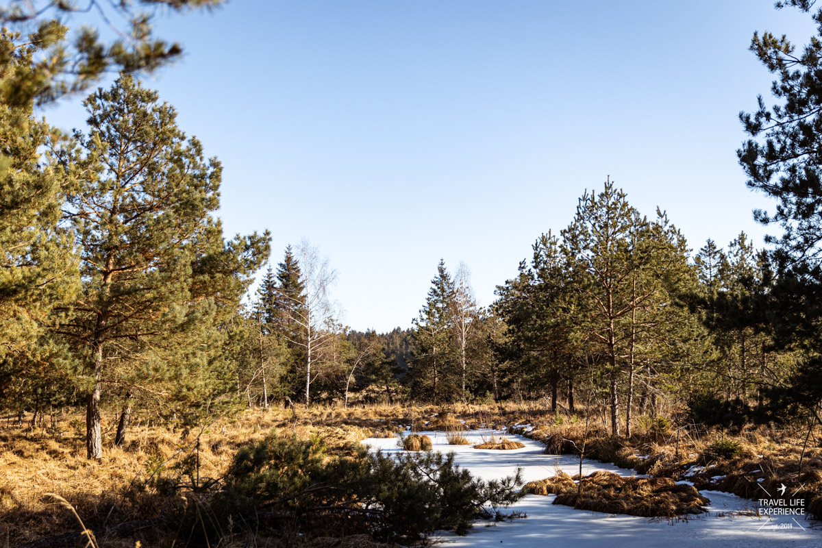 Mitten im Moor findet man eine Holzhütte mit einer einfachen Bank davor, die perfekt für eine Pause in der Sonne geeignet ist. Wir haben dort den zweiten Teil unserer mitgebrachten Verpflegung genossen und wollte von dort gar nicht mehr weg. Die wärmende Februarsonne, die magische Moorlandschaft um uns herum und außer dem Gezwitscher der Vögel keine Geräusche. Perfekt um den Augenblick und die Schönheit der Natur zu genießen und abzuschalten.